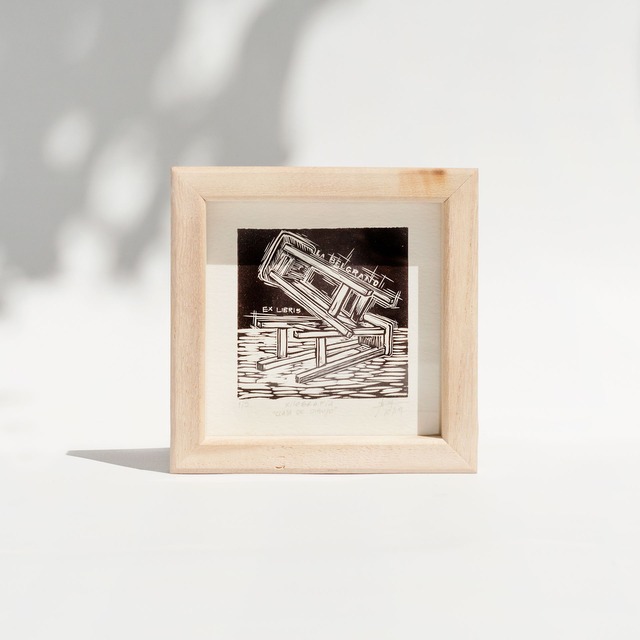 Ex libris - xilografía sobre papel de algodón enmarcado en marco de 15 x 15 cm en madera de kiri con vidrio. Edición limitada, copia 1 de 5.